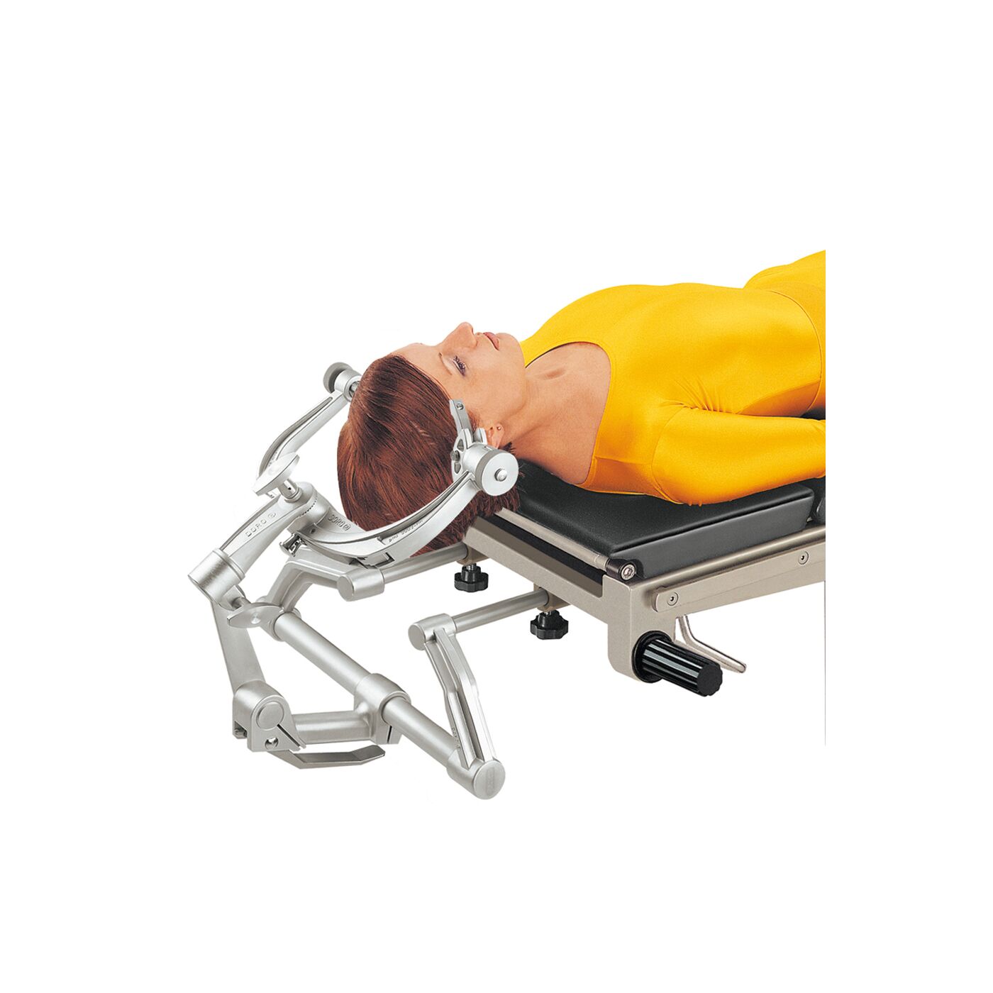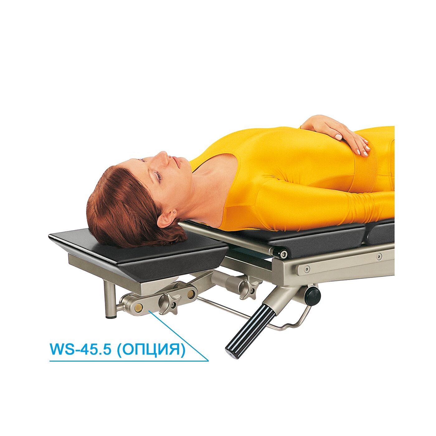 Наклон осуществляется с помощью кривошипа, который расположен на боковой стороне стола (под сегментом сиденья). Поворот кривошипа влево / вправо приведет стол в нужное положение. Опционально, регулятор боковых наклонов может быть установлен от стороны головы пациента.